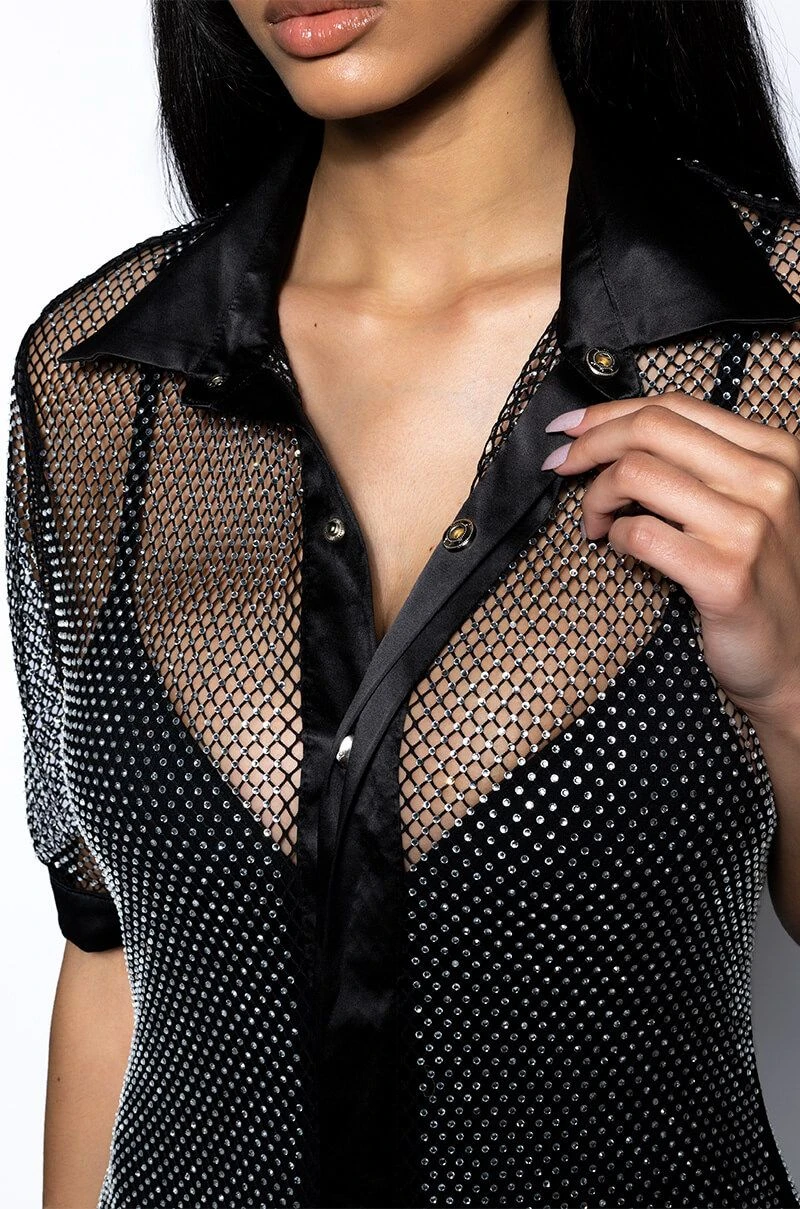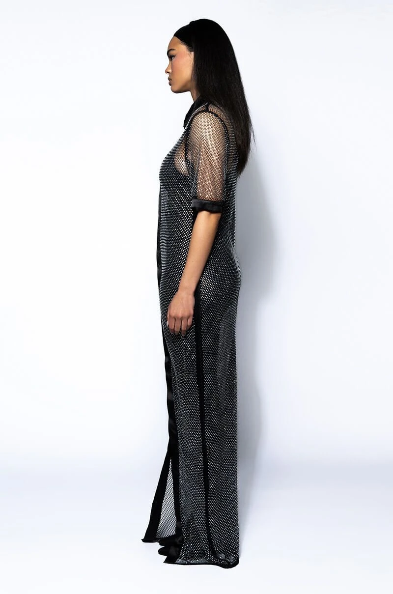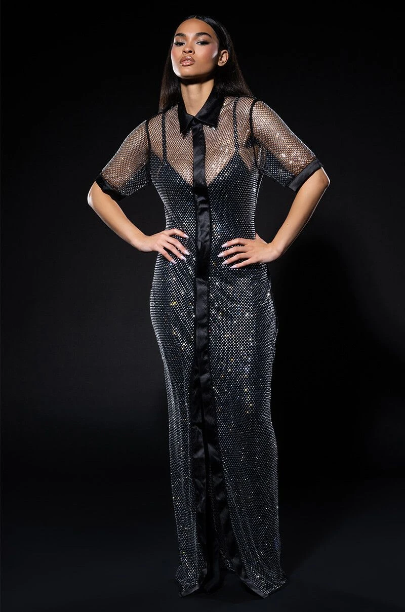 The AKIRA Label All Eyes Sparkle Rhinestone Polo Maxi Dress is made from a sheer rhinestone netting fabrication and features a collared neckline, boxy sleeves, a polo-like design, a sexy bodycon fit, satin trim along the collar, cuffs, and placket, and a maxi length silhouette. Complete with a covered snap button front placket.