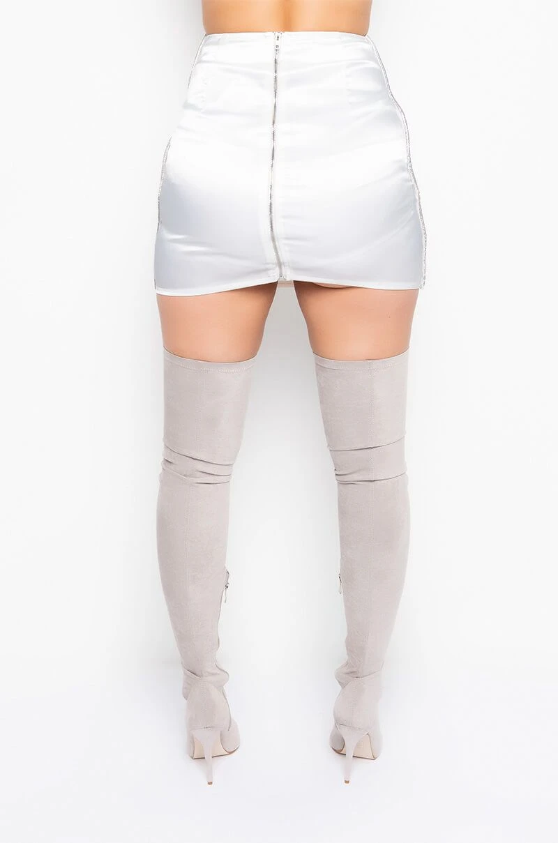 The AKIRA Label Baddie Season Satin Rhinestone Mini Skirt features a lined satin fabrication, mini length hem, and silver rhinestone tubing along the sides. Complete with an exposed back zipper. Style with the coordinating Baddie Season Satin Rhinestone Halter Crop Top.