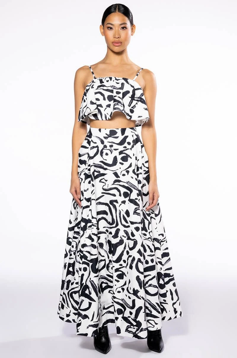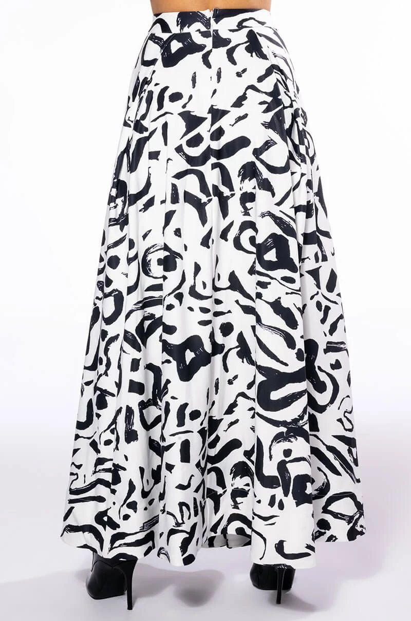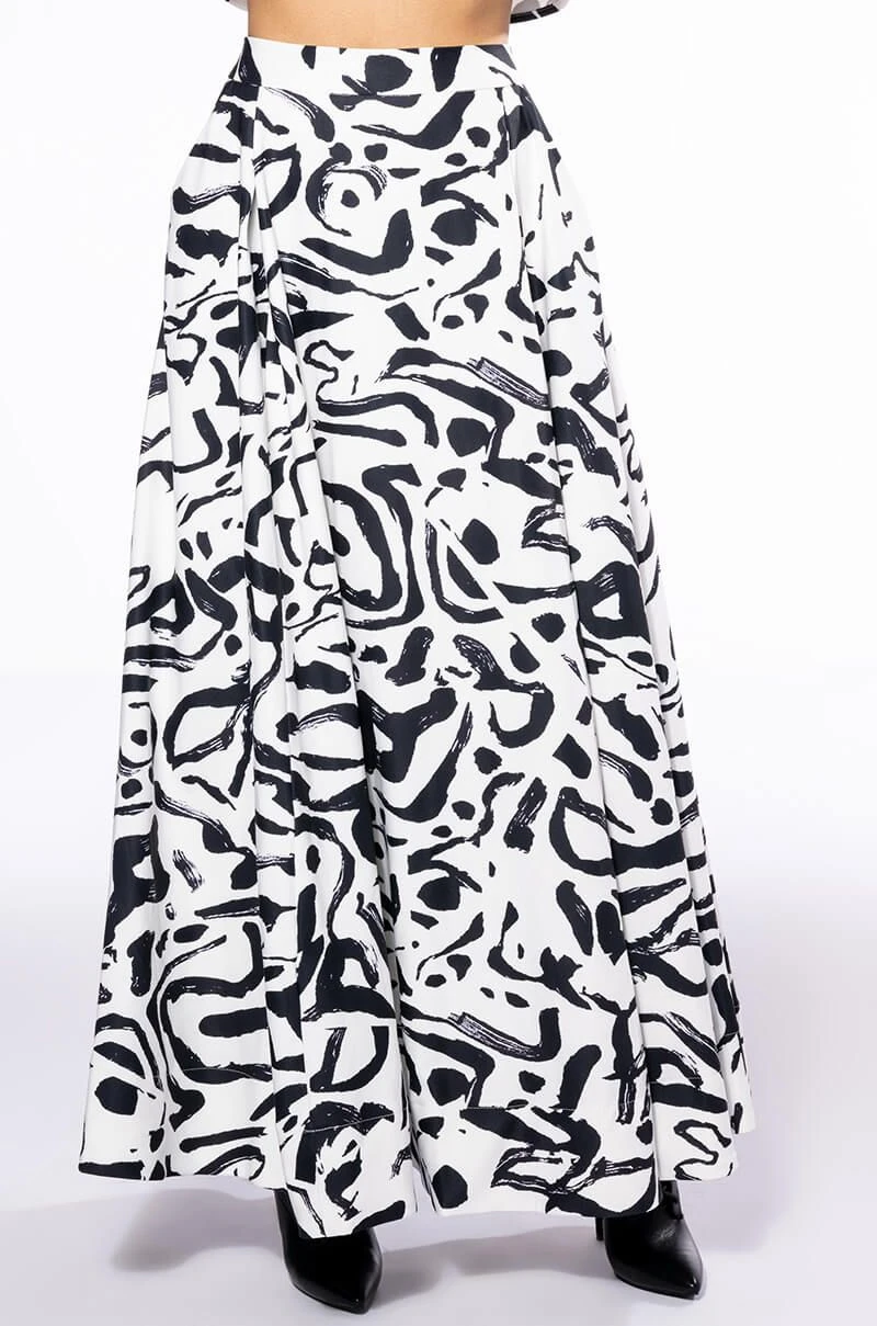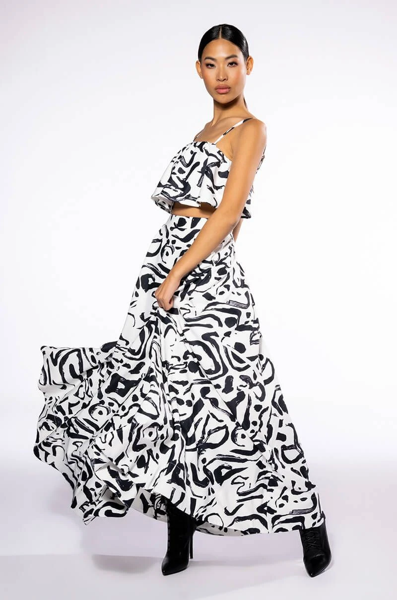 The AKIRA Label Daliโs Muse Abstract Maxi Skirt is a sophisticated skirt complete with a smooth fabrication, graphic digital brushstroke print patterning, slant side pockets, pleat front detailing, and a flowing maxi length. Complete with a satin inner lining and a concealed back zipper closure. Pair with the coordinating AKIRA Label Daliโs Muse Bandeau Abstract Top to complete the look.