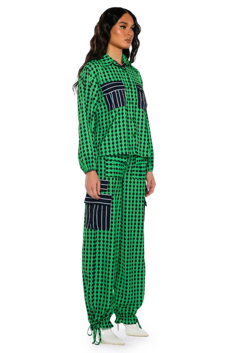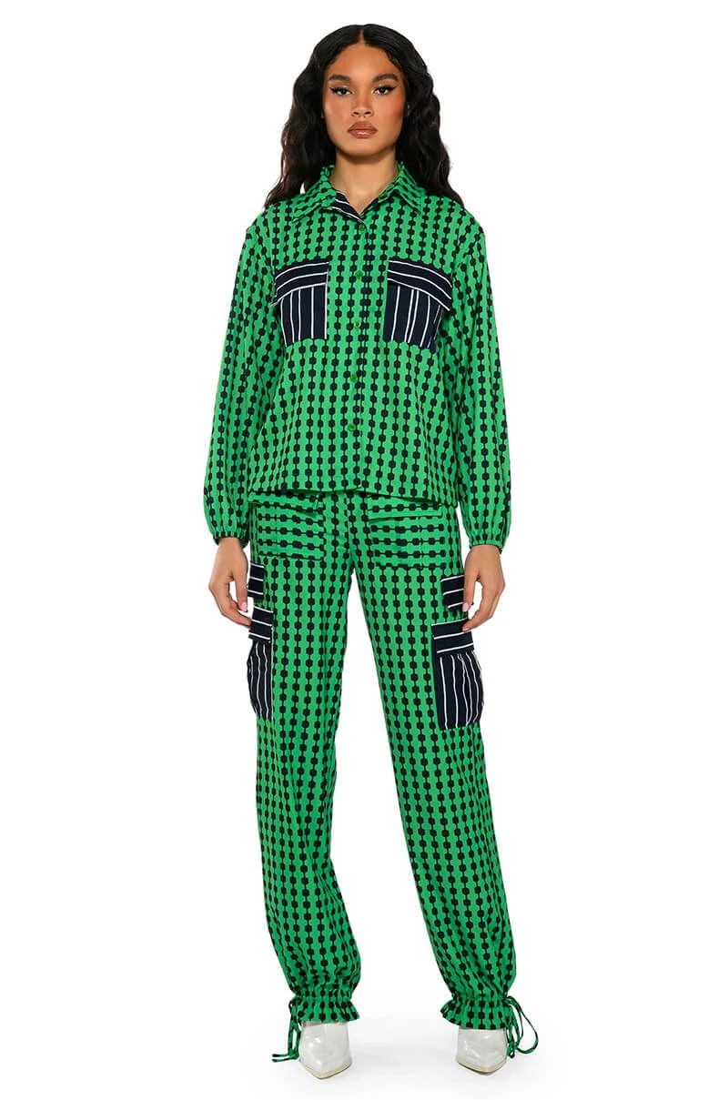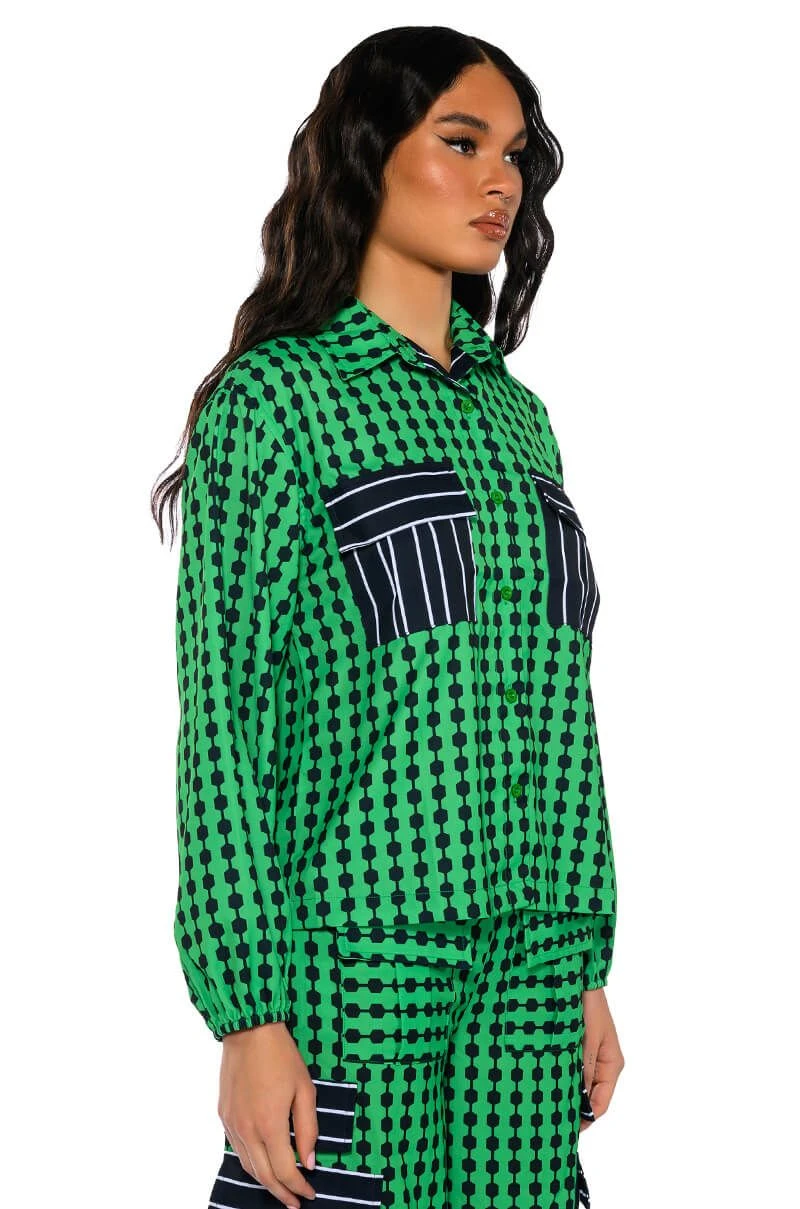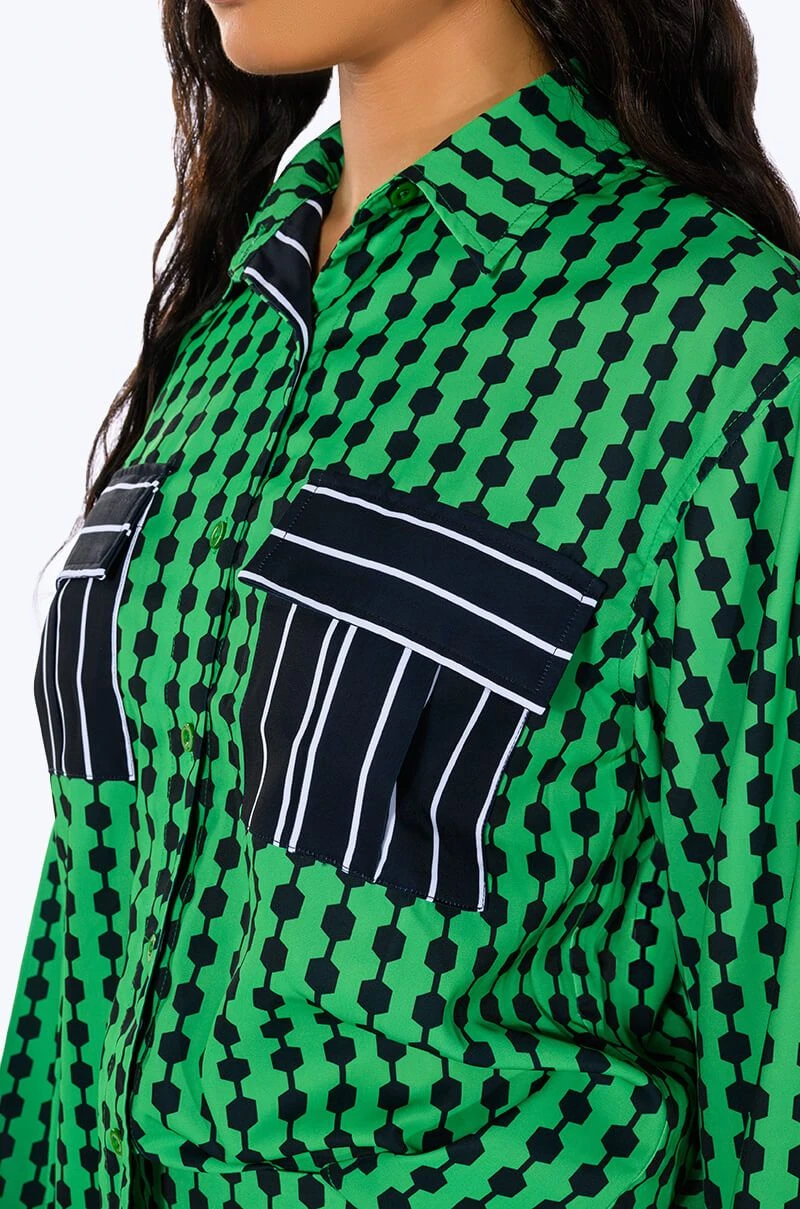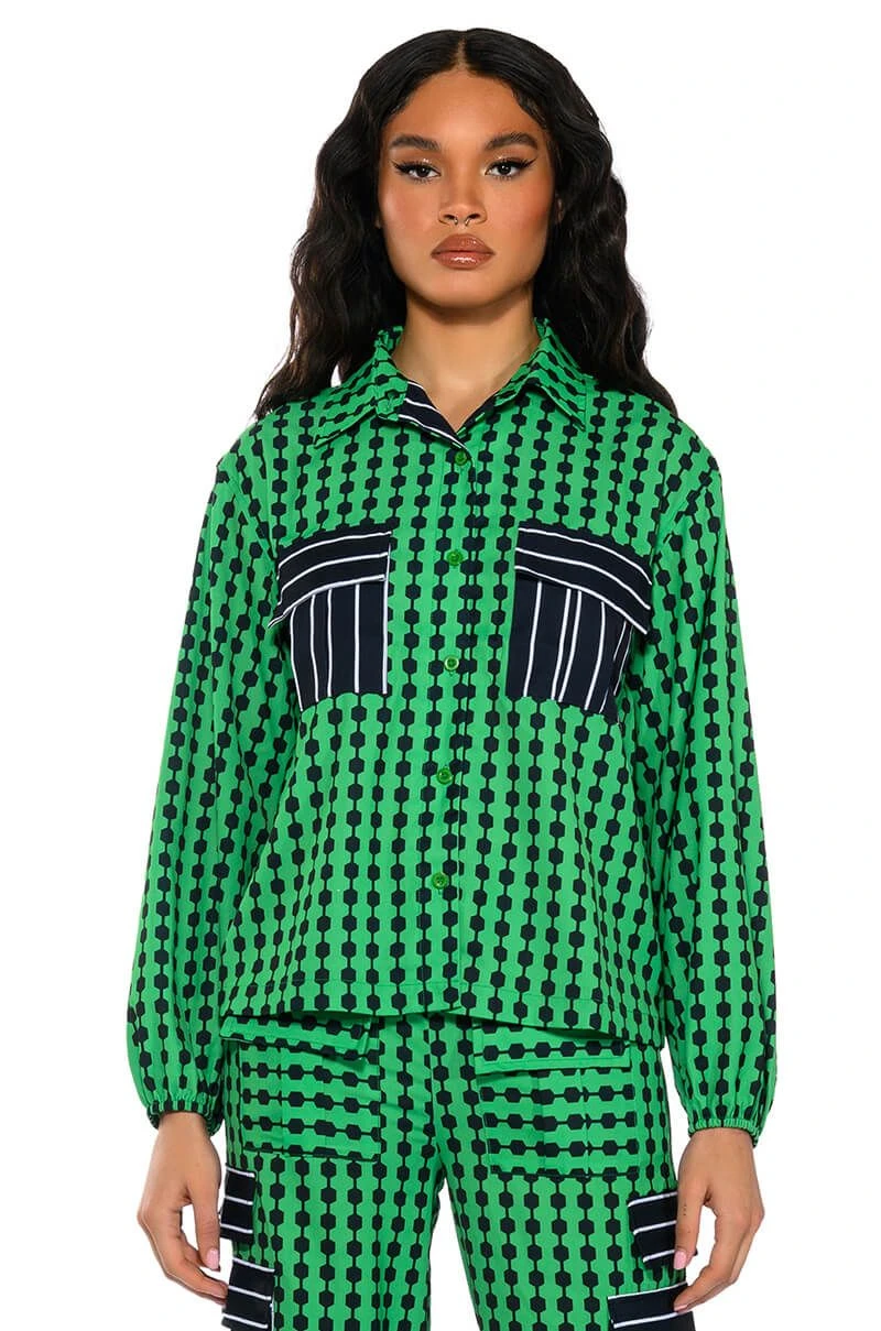 The AKIRA Label Patterns Please Button Down Blouse features a smooth, lightweight fabrication, geometric print patterning, and contrast stripe print flap front chest pockets. Complete with a fold over point collar, long sleeves, buttoned cuffs, and a button down front placket. Pair this bold top with the coordinating Patterns Please Jogger Pants for a bold look.