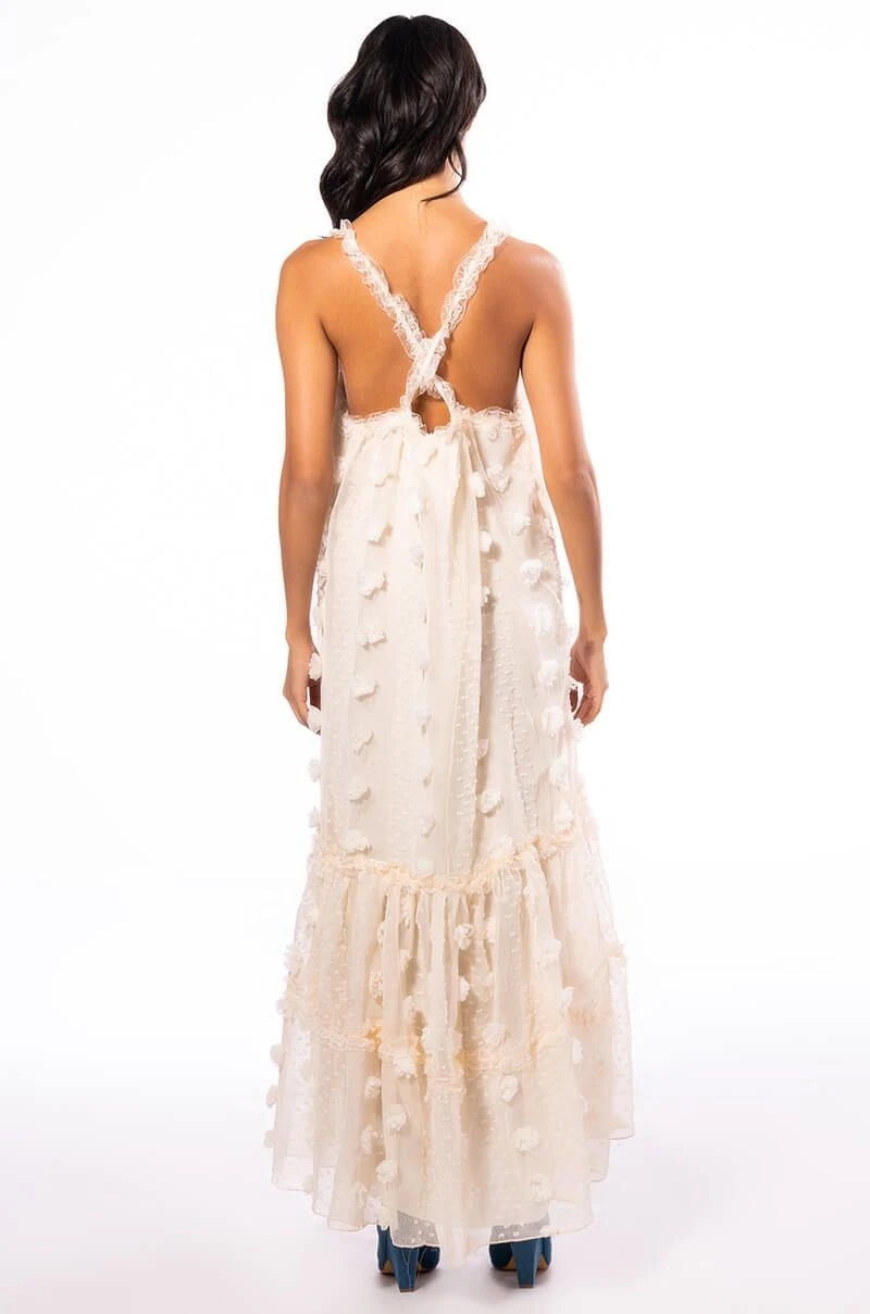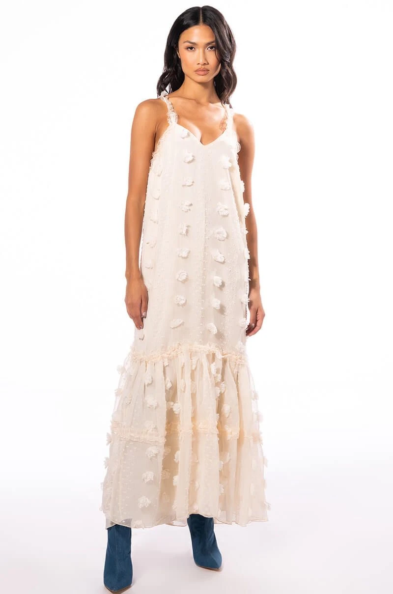 Float among the flowers with the AKIRA Label Hidden Garden Floral Detail Maxi Dress! This trapeze-style piece is made from a mesh overlay with textured blossoms and clipped dots featuring a scoop neckline, cross back elastic tank straps with ruffled lace trim, slick, opaque lining, a maxi length silhouette, ruffle trim detailing, and a pull-on fit. Style this piece with Western boots and a longline cardigan to finish off your whimsical look.