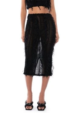 The AKIRA Label Its A Wrap Macrame Mesh Midi Skirt features a sheer, textured macrame mesh fabrication, a pull-on fit, vertical fringe stripe detailing, a bodycon midi silhouette, and a subtle back slit. Complete your set with the matching AKIRA Label Its A Wrap Macrame Mesh Sleeveless Mock Neck Top.