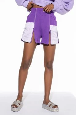 The AKIRA Label Kaia Satin Detail Short is made from a classic sweat fabrication and is complete with front satin flap pockets, a high rise waistline, and two front zipper detailed closures.