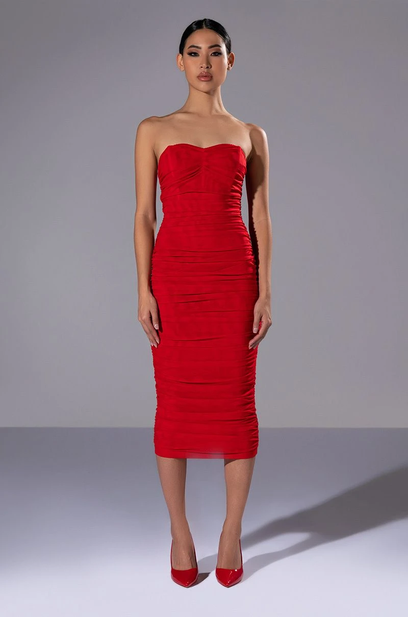 Speak up loud and proud in The AKIRA Label Like I Said Strapless Midi Mesh Dress! This sultry piece is made from a layered mesh fabrication and features a sweetheart neckline, a strapless design, boning for structure, a sexy bodycon fit, a midi length silhouette, ruched body detailing, and a tonal back zipper closure. Pair this piece with strappy sandals and a clutch to complete your sexy look.