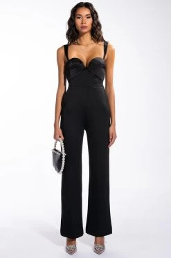 The AKIRA Label London Rhinestone Stripe Relaxed Fit Halter Neck Jumpsuit is made from a light cotton fabrication and features rhinestone stripe body detailing, a tie halter, an open back, a plunging neckline, a sleeveless silhouette, a drop waist, cargo flap side pockets, harem-style relaxed pant legs, and a side zipper closure.