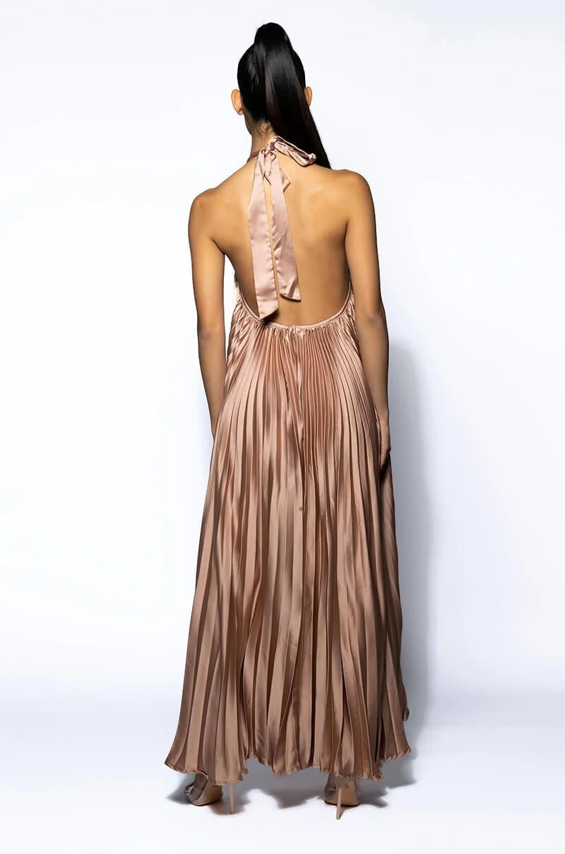The AKIRA Label Make Me Sway Pleated Halter Maxi Dress is made from a pleated, lightweight fabrication and features a tie halter, a high, rounded neckline, a sleeveless design, and a flowy, maxi length silhouette. Complete with a tonal back zipper closure. Pair this piece with stiletto sandals to dance the night away.