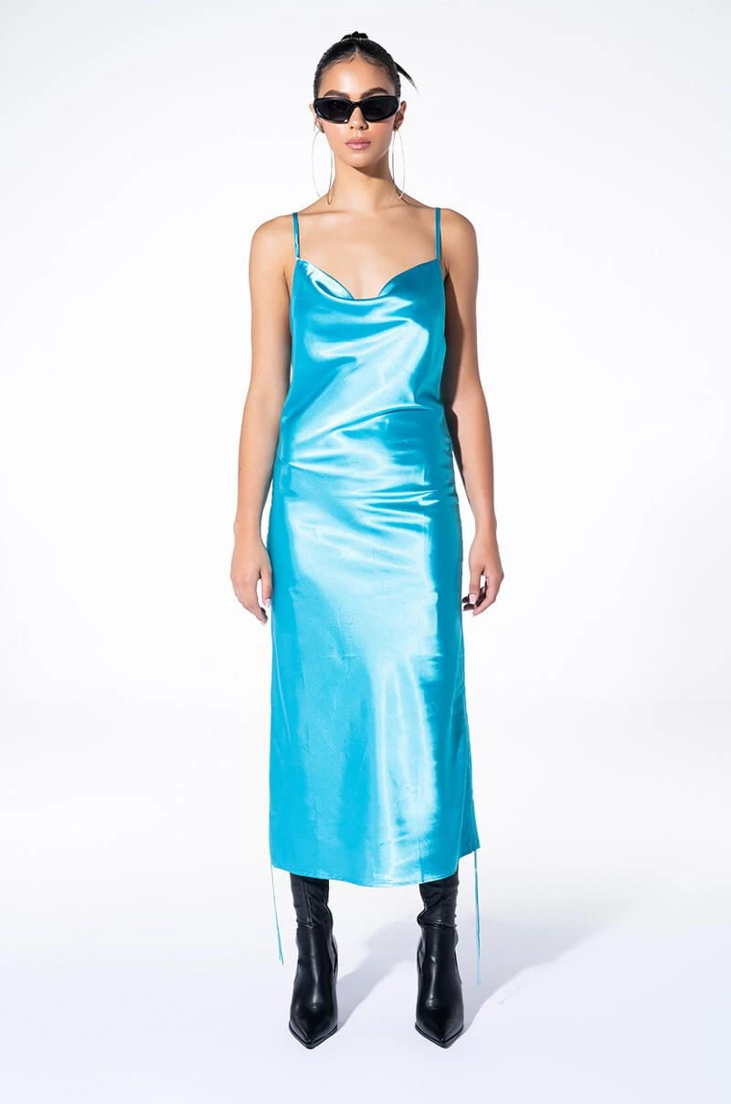 The AKIRA Label Making Memories Mini Dress is made from a luxe satin fabrication and features adjustable spaghetti straps, a seductive cowl neckline, a mini length silhouette, adjustable, asymmetrical side ruched detailing, and a pull-on fit. Pair this piece with stiletto pumps and a rhinestone shoulder bag for a flirty going-out look.