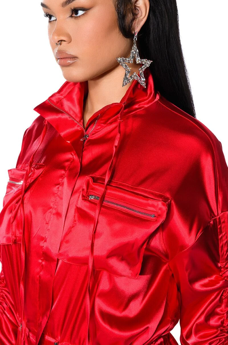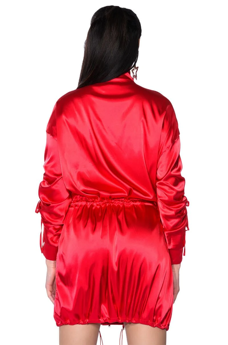 The one-of-a-kind AKIRA Label On The Road Satin Utility Mini Dress is made from a luxe, satin base fabrication and features a mock neck collar with drawstring detail, long sleeves with adjustable drawstrings for a ruched look, and a front zipper closure. Complete with a dual drawstring waist and bottom hem, front zippered pockets, and a mini length. This versatile number can be styled with stiletto boots for a chic hot girl look.