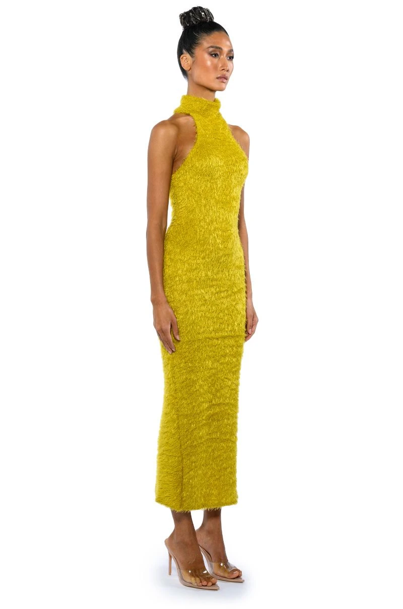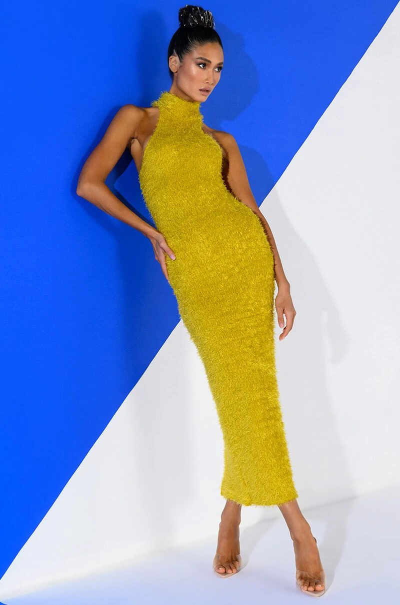 Cozy girl energy! The AKIRA Label On We Go Textured Maxi Dress in Chartreuse is made from a fuzzy, soft knit fabrication and features a halter neckline, a mock neck, a sleeveless silhouette, a sexy bodycon fit,and a maxi length silhouette. Complete with a back slit for mobility and a slip-on fit. Pair with lace-up heels and a shoulder bag to complete your look.