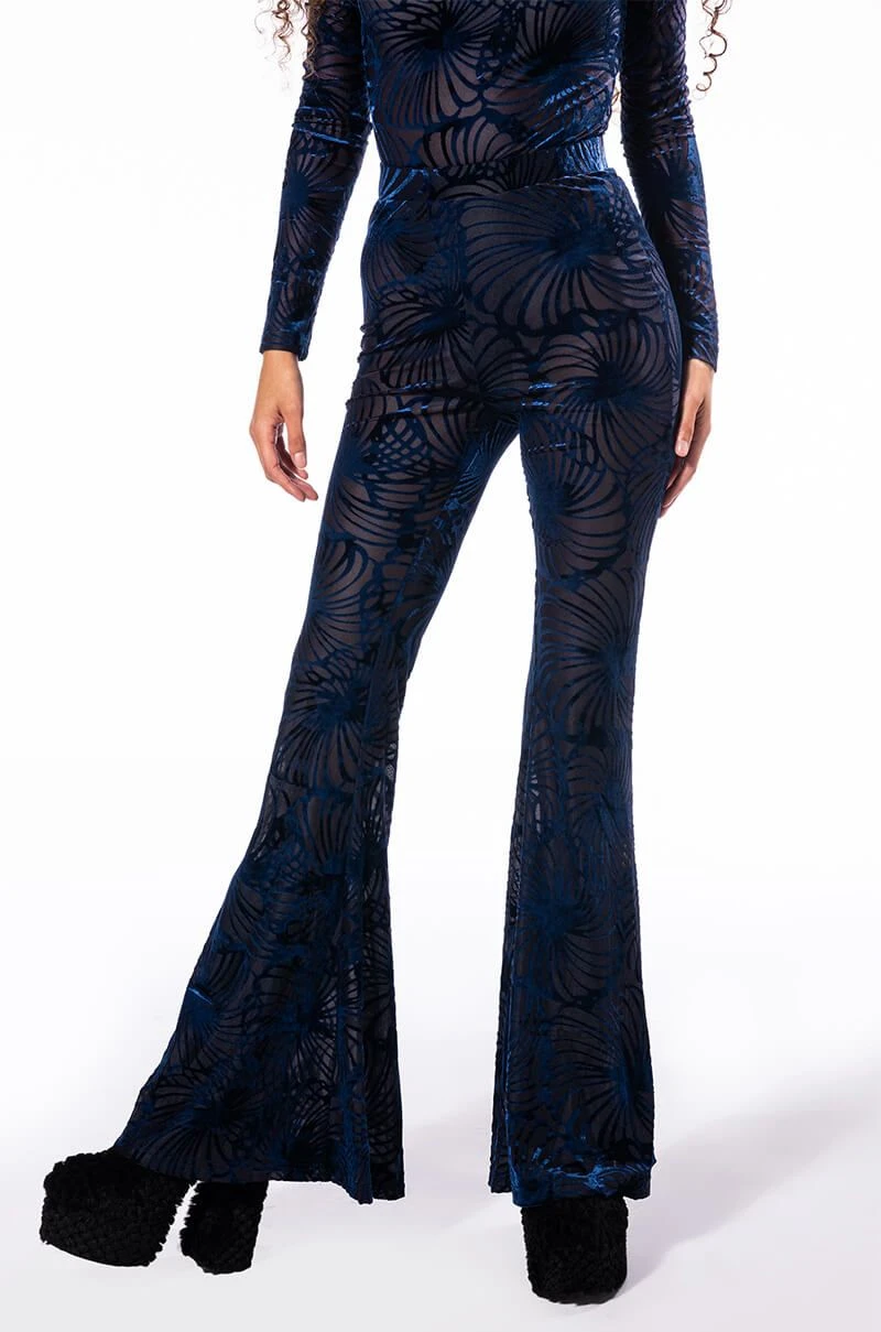 The AKIRA Label Tropic Like Its Hot High Rise Flare Pant is a high rise flare legging featuring a sheer mesh base, a velvet burnout swirl print design, a wide elastic waistband, and a pull on fit. Pair with the coordinating AKIRA Label Tropic Like Its Hot Long Sleeve Mock Neck Bodysuit for a complete look.